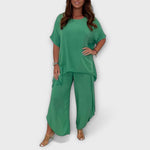 Descubre nuestro conjunto de dos piezas, cómodo y desenfadado, que combina una elegancia sencilla con el máximo confort. Perfecto para el uso diario, este conjunto une una blusa holgada con unos pantalones largos y casuales — ideal para la primavera, el verano y el otoño.
