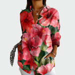 La camisa de manga larga con estampados florales llamativos en tonos rojos y rosas aporta vitalidad y un aire veraniego a cualquier conjunto. El cuello clásico y el cierre de botones la hacen versátil, ideal tanto para ocasiones casuales como elegantes.