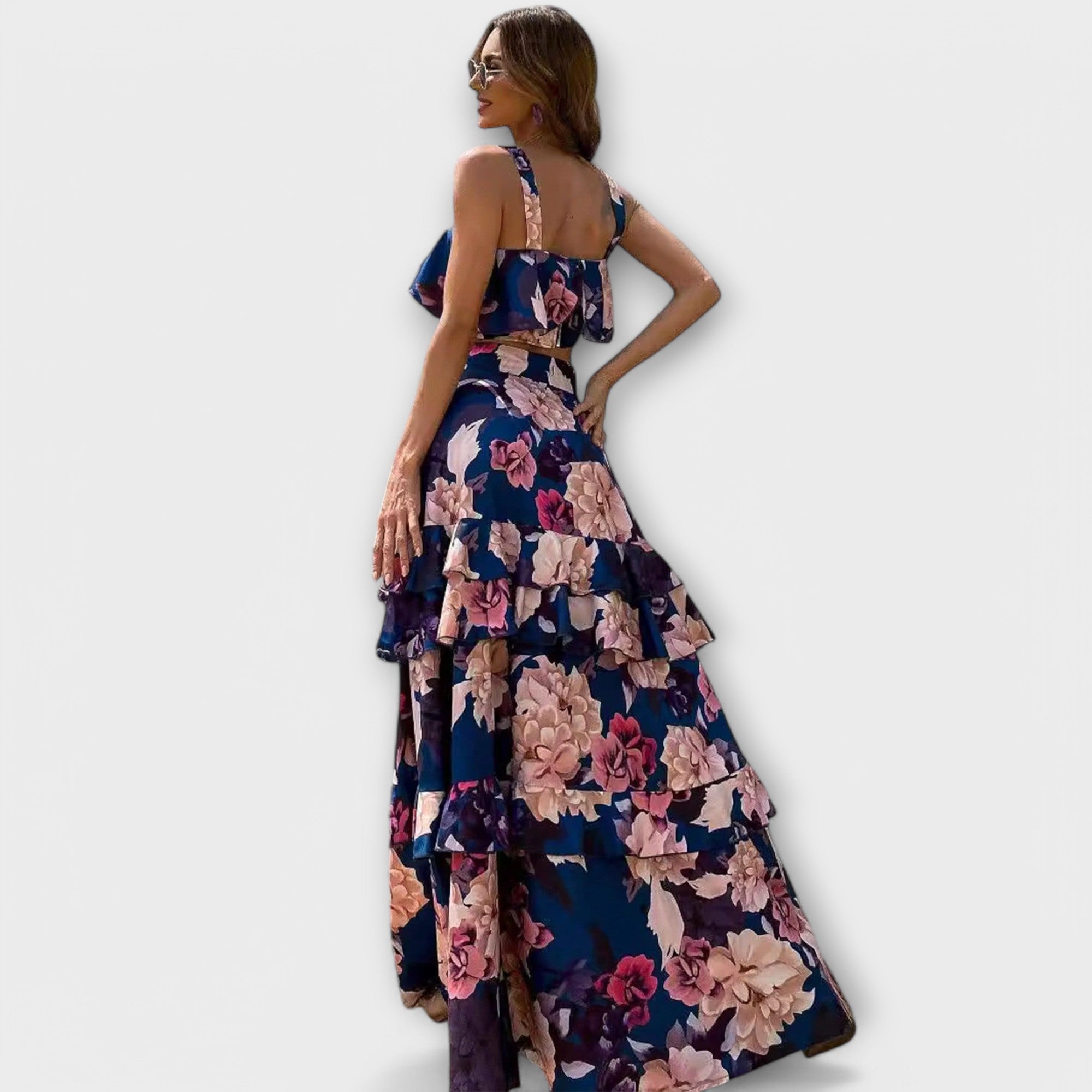 Añade un toque de elegancia a tu armario con este vestido de tirantes y falda en capas, en un maravilloso tono azul.