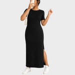 • Líneas limpias, corte moderno y un toque de sensualidad gracias a la abertura lateral: este vestido largo de manga corta está pensado para acompañarte con estilo en cada paso.