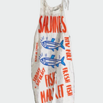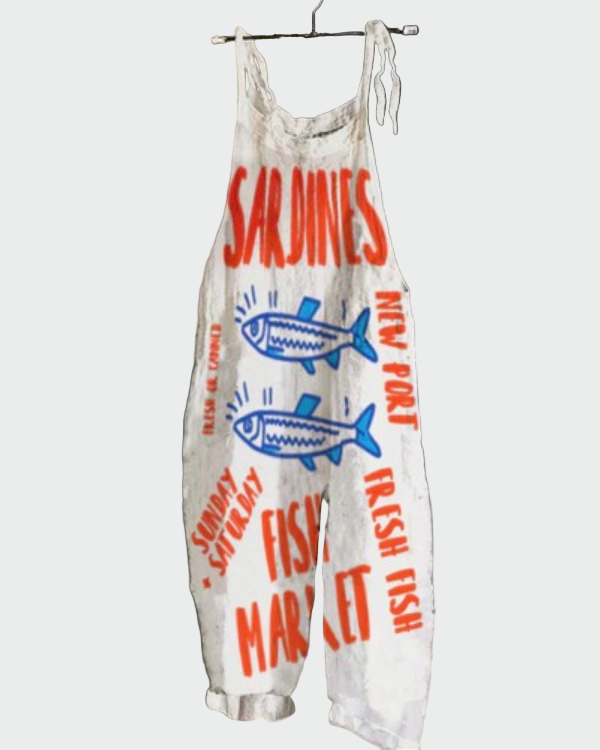 O Fish Market es un mono único y divertido que evoca un cartel vintage de mercado de pescado. Los detalles llamativos en rojo y azul con las palabras “SARDINES”, “FRESH FISH”, “FISH MARKET”, combinados con gráficos de peces, crean un look intenso y exclusivo.
